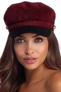Make a chic statement with this trendy color block cabby hat! It is a traditional style cabby hat with a short brim and gold hued button details. The crown of the hat is a burgundy hue while the brim has a black hue. Includes a lining.
