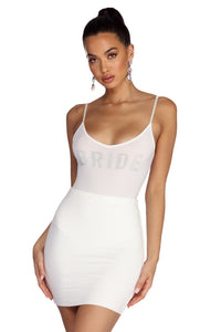 Here comes the bride! Make sure everyone knows whose special day it is with this adorable ivory bodysuit! It features a sleeveless bodice, adjustable spaghetti straps, a V neckline, a square back, a thong bottom with snap button closures, and a screen that reads "Bride" in glimmering heat stones. Bodysuit is composed of a stretchy knit fabric.Model is 5'7" with a 34" bust, 24" waist and 36" hips. She is wearing a size small.