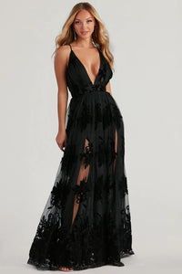 Enchant in this long tulle formal dress featuring a sultry plunge V-neckline and empire waist that leads to dual high front slits along the sweeping floor-length silhouette. Perfect for weddings or black tie soirees.