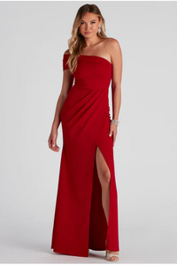 Special OccasionHug that body tight without giving away too much in our Kaleigh dress! She features an asymmetrical off the shoulder neckline, ruching down the sides, a high side slit and a stretchy body hugging fabric. She is lined with a smooth knit fabric.