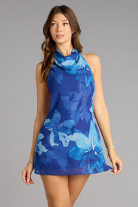 Meet your next weekend obsession. This floral halter mini dress brings vacation energy anywhere you wear it, with its draped halter cowl neckline, open tie back, and flowy fit. Perfect for rooftop brunches, date nights, or celebrations.