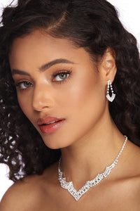 ¡Deslumbra como la realeza con este hermoso juego de diamantes de imitación plateados! El collar tiene un intrincado diseño festoneado con cierre de mosquetón. Los pendientes a juego tienen forma de lágrima y cierre posterior.