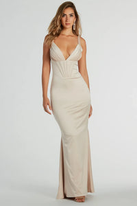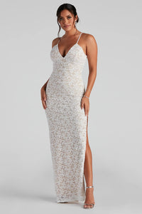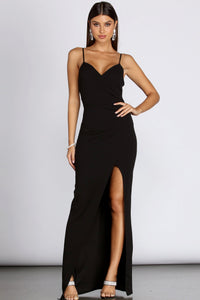 Cautiva con nuestro vestido Sasha que eleva tu velada con elegancia. Presenta una espectacular abertura lateral alta para lucir tus glamurosos tacones, un escote en V cruzado asimétrico y pronunciado, detalles fruncidos en todo el corpiño, tirantes finos ajustables y una silueta amplia hasta el suelo. Complete un impresionante look de vestido de noche con un bolso de mano de pedrería y tacones .