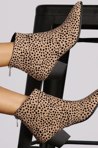 ¡Manténgalo feroz con estos botines con estampado de leopardo de inspiración salvaje! Cuentan con un ajuste alrededor del tobillo, un cierre de cremallera en la parte posterior, un dedo del pie puntiagudo y un tacón bajo apilado. Los botines están compuestos de un material similar al lienzo y detalles de fieltro.