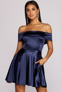 Eres conocido por tus movimientos: ¡hazlos con nuestro vestido Jess de satén azul medianoche dinamita! Presenta un escote con los hombros descubiertos, un corpiño sin mangas sin costuras con detalle de pliegues y cremallera en la espalda, y una minifalda acampanada con bolsillos en cada cadera. Jess está hecho de un material suave y brillante con elasticidad moderada.La modelo mide 5'9” con un busto de 32”, cintura de 24.5 y caderas de 35”. Lleva una talla pequeña .